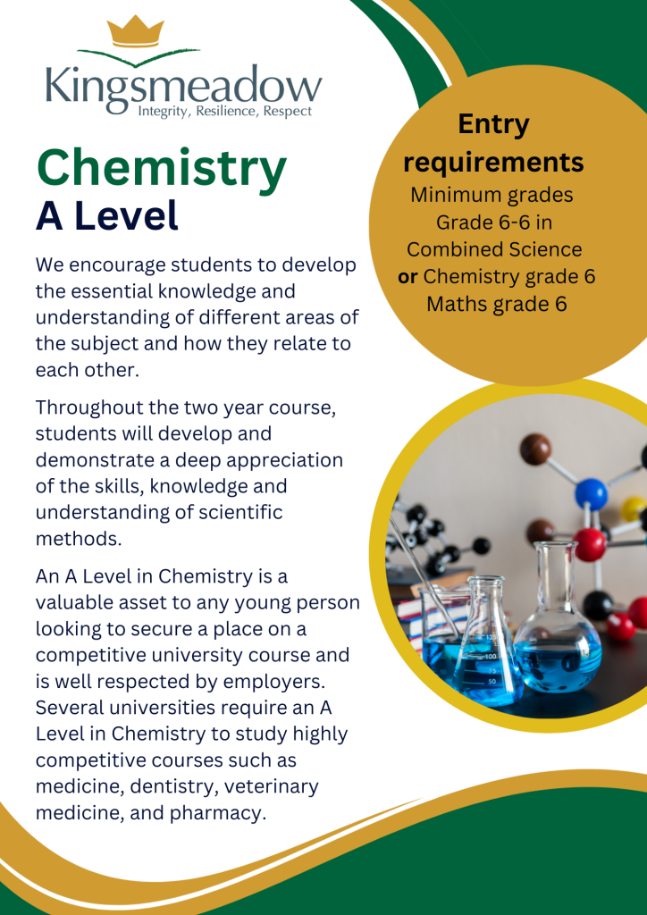 An A Level in Chemistry is a valuable asset to any young person looking to secure a place on a competitive university course and is well respected by employers. Several universities require an A Level in Chemistry to study highly competitive courses such as medicine, dentistry, veterinary medicine, and pharmacy.
