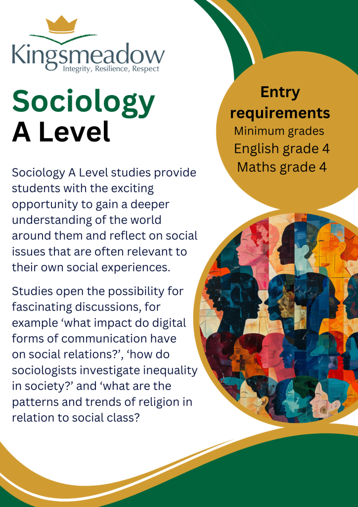 Sociology A Level studies provide students with the exciting opportunity to gain a deeper understanding of the world around them and reflect on social issues that are often relevant to their own social experiences. Studies open the possibility for fascinating discussions, for example ‘what impact do digital forms of communication have on social relations?’, ‘how do sociologists investigate inequality in society?’ and ‘what are the patterns and trends of religion in relation to social class?’